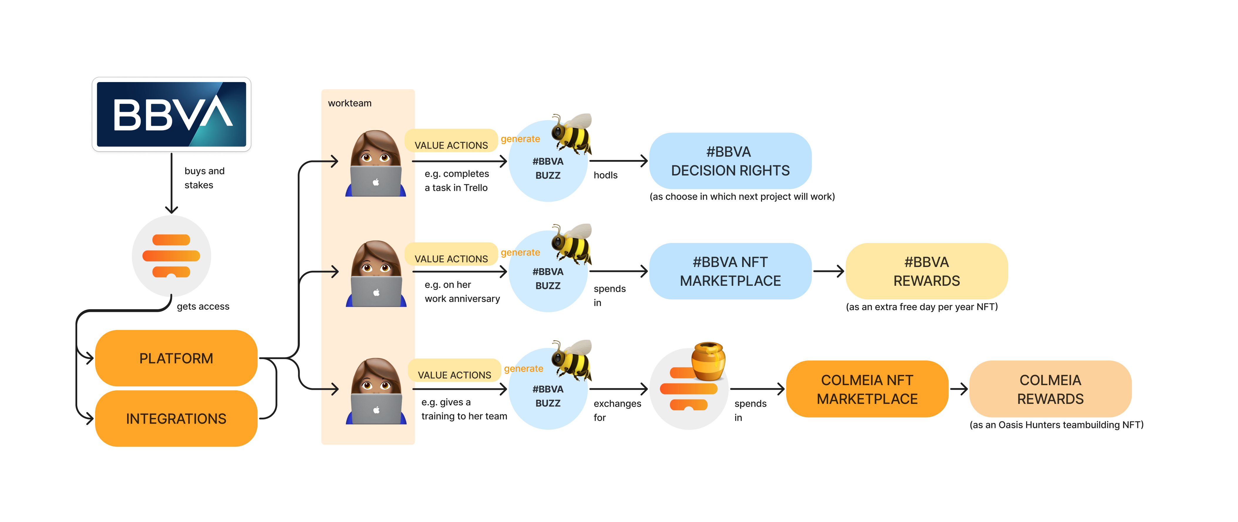 These employees could vote on the next project they want to work on, or to what cause the extra profit for that year is going to be used, with the BBVA BUZZ they have held. They can also exchange the BBVA Buzz for rewards from the BBVA Marketplace (such as an extra day off) or for our $HONEY token to gain access to exclusive rewards (such as group team building).